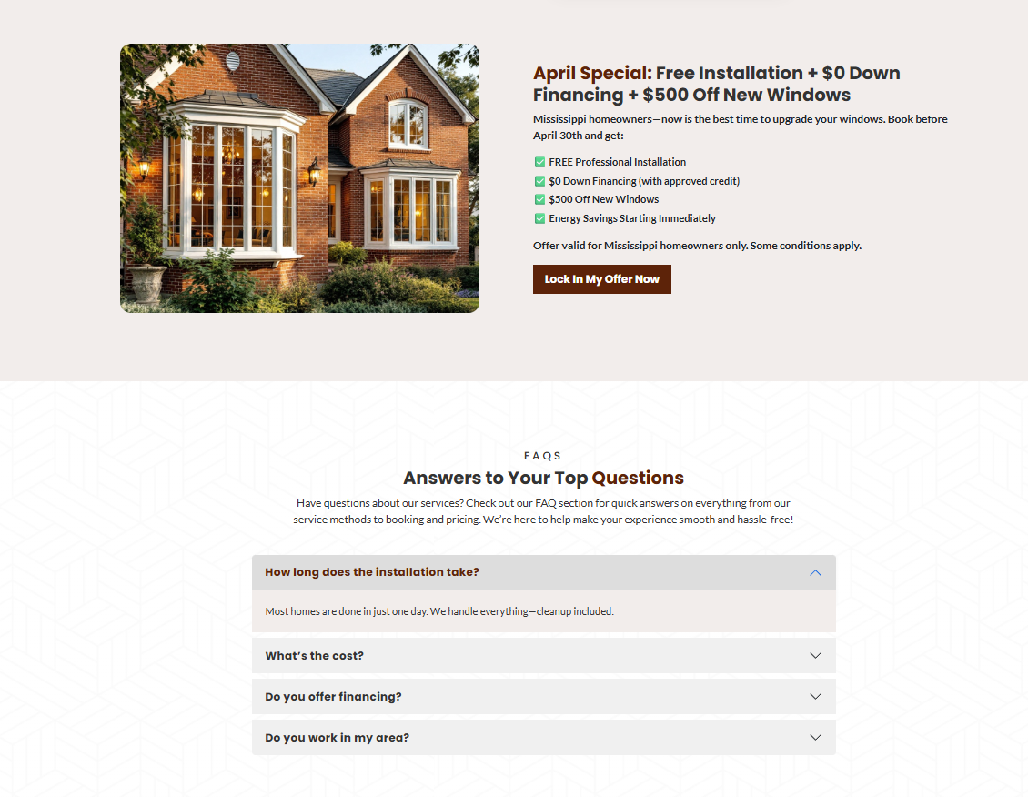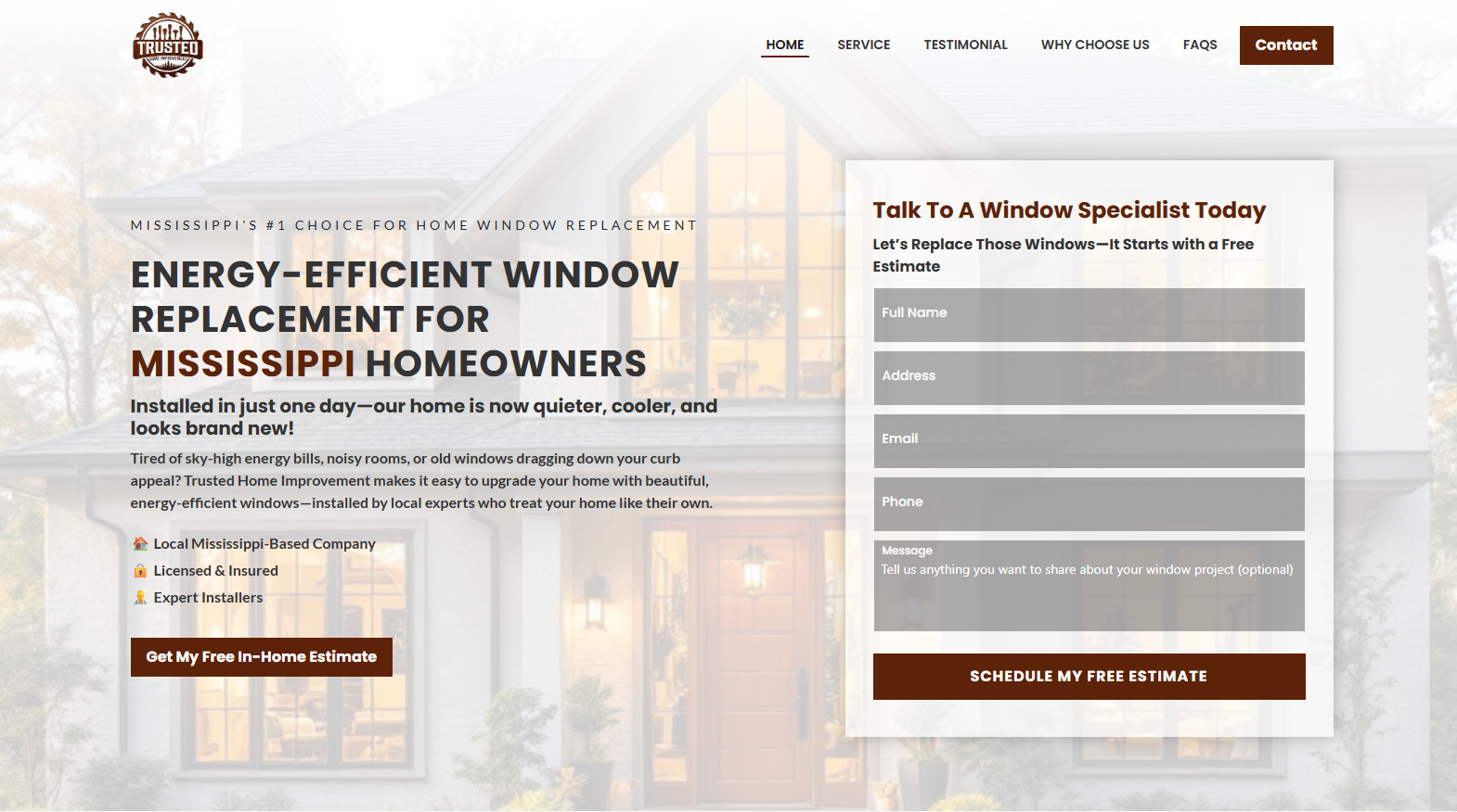 A professional, responsive website designed for a home improvement company specializing in energy-efficient window replacements. Features include service descriptions, customer testimonials, and a contact form to boost customer engagement and trust. Built with modern web technologies for a clean and user-friendly experience.